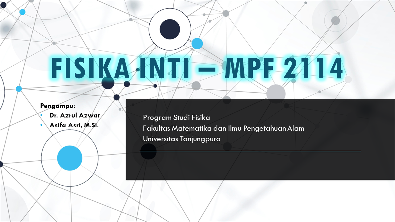 - Mata kuliah ini bertujuan untuk memberikan pemahaman yang mendalam tentang struktur inti atom, interaksi antarpartikel subatomik, dan fenomena fisika yang terjadi di dalam inti atom.